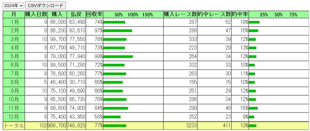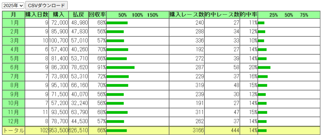 本日2025年のIPAT収支が確定し、回収率66%、金額としては約33万円のマイナスとなった(友人や妻に頼まれた馬券も含まれるので多少誤差あり)。昨年の回収率77%と比べると大きく成績を落としており猛省。年間購入金額は概ね95万くらいなのでざっくり言って100万使って70万取り返す、といった見立てになる。2026年も回収率80%目指してブレずに勝負していきたい。騎手別では購入金額トップが戸崎、回収率は74%とまずまず。2番手以降は丹内、松山、横山武と続くが回収率は55%、42%、54%とひどく来年以降の馬券戦術は再考せねばなるまい。回収率プラスは木幡巧、田口、内田博が筆頭となっており地味な脇役が重要か?リーディング上位騎手は人気になるので相手にはするべきだが軸としてはデータ上旨味が無い、という事実は認識せねばなるまい。